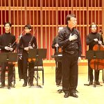 Leyendas: An Andean Walkabout for String Quartet (2001) by Gabriela Lena Frank (b. 1972) offered six movements on South American music. In the opening Toyos movement four classical instruments imitated various sounds parallel to the range of indigenous panpipe, which had the effect of translating traditional folk music into contemporary minimalism; this unusual approach was both shocking, innovative, and illuminating. Tarqueada likewise imitated sounds of the tarka, a heavy wooden duct flute blown harshly in order to split the tone; this was performed in such rapid fourths and fifths, producing an astonishing effect. Himno de Zampoñas imitated a chorus of zampoña panpipes; to get the effect of their rather flat sound, these four instruments delivered a multitude of double stops which offered a mischievous and amusing effect. Chasqui described the journey of fast-running indigenous messengers; to create this lighter, faster effect the sound of flute and strummed guitar were imitated (with Baldwin’s cello playing high notes). Canto De Veloria presented the sounds of professional indigenous funeral mourners, growing from one to a crescendo chorus with intricate, rapid picking of all four strig instruments to indicate guitar accompaniment—this surging movement was powerfully impressive, as it also celebrated mestizo culture by including the famous medieval Dies Irae chant. Concluding Coqueteos dramatized male romance singers ever growing into a larger chorus (again with fierce string picking that was astonishing). This finale produced the theme of love as an awesome wonder that transformed society to a higher level of awareness. It was a marvel to hear traditional Western instruments played in this manner; the difficulty of playing demanded extraordinary plucking!
